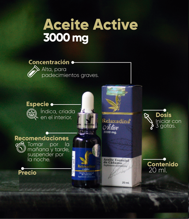 CBD Premium Active 3000 mg de Relaxadina ofrece la concentración más potente de la línea Active, ideal para casos severos como dolor crónico, fibromialgia, esclerosis múltiple, cáncer o diálisis. Su fórmula de alta potencia está diseñada para personas con alta tolerancia al CBD, que buscan un efecto profundo sin perder claridad mental